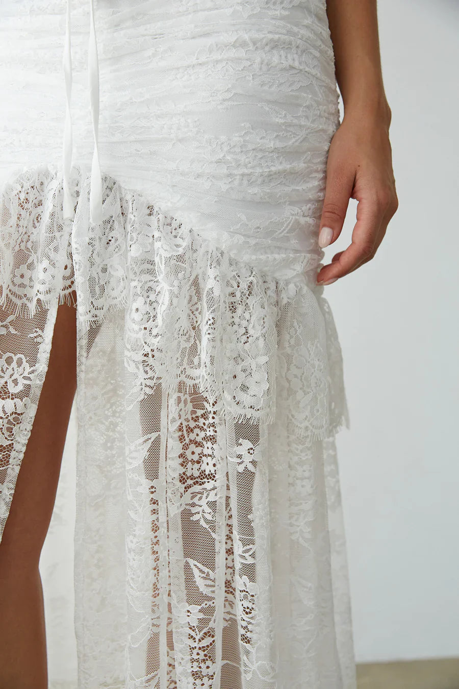 Hopelessly romantic, the Aphrodite Lace Ruched Rosette Maxi Dress is ! Fall in love with this lace featuring a lace rosette, high-low silhouette, and ruffle embellishments! Available in white; pair this angelic number with a pair of to complete the look!