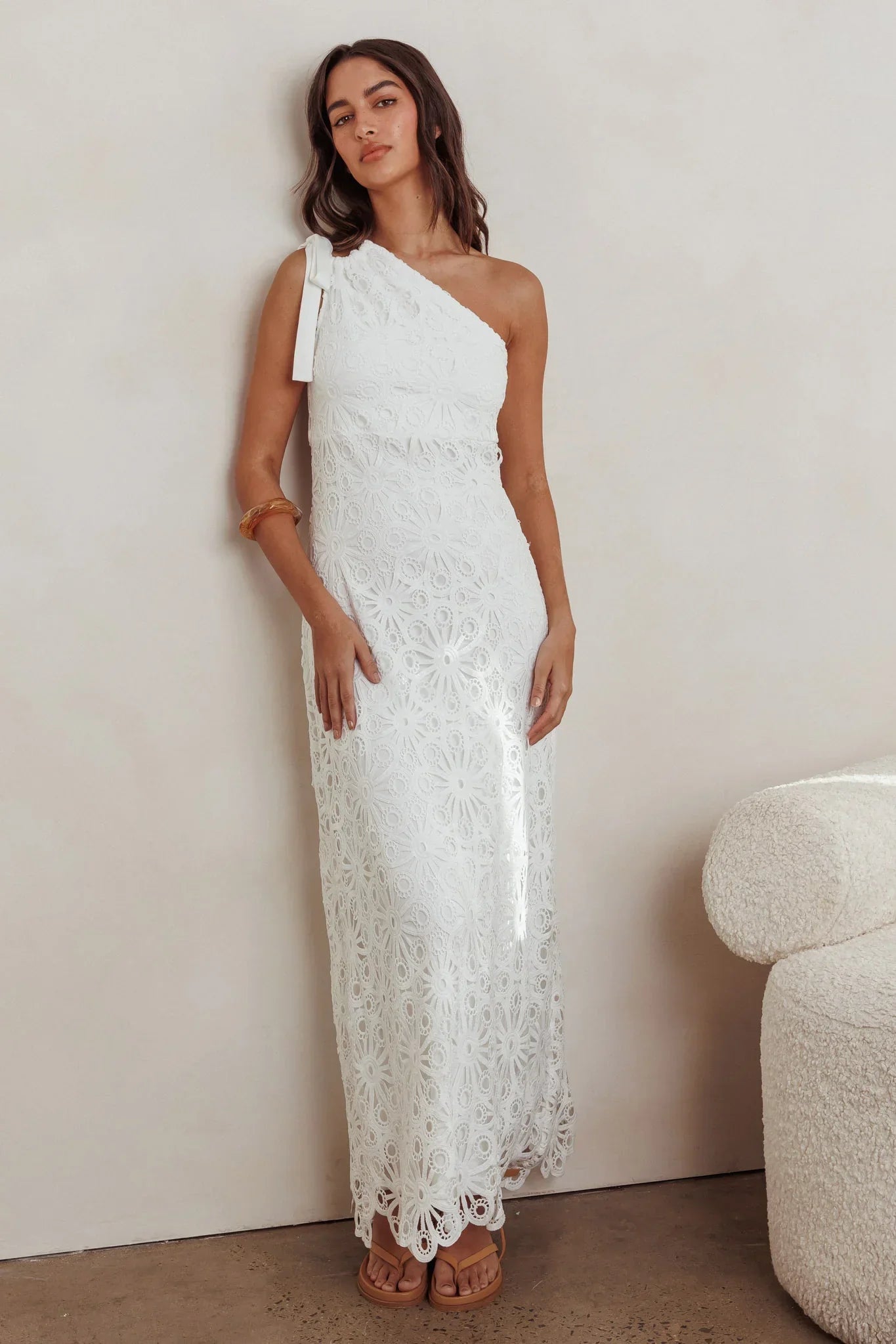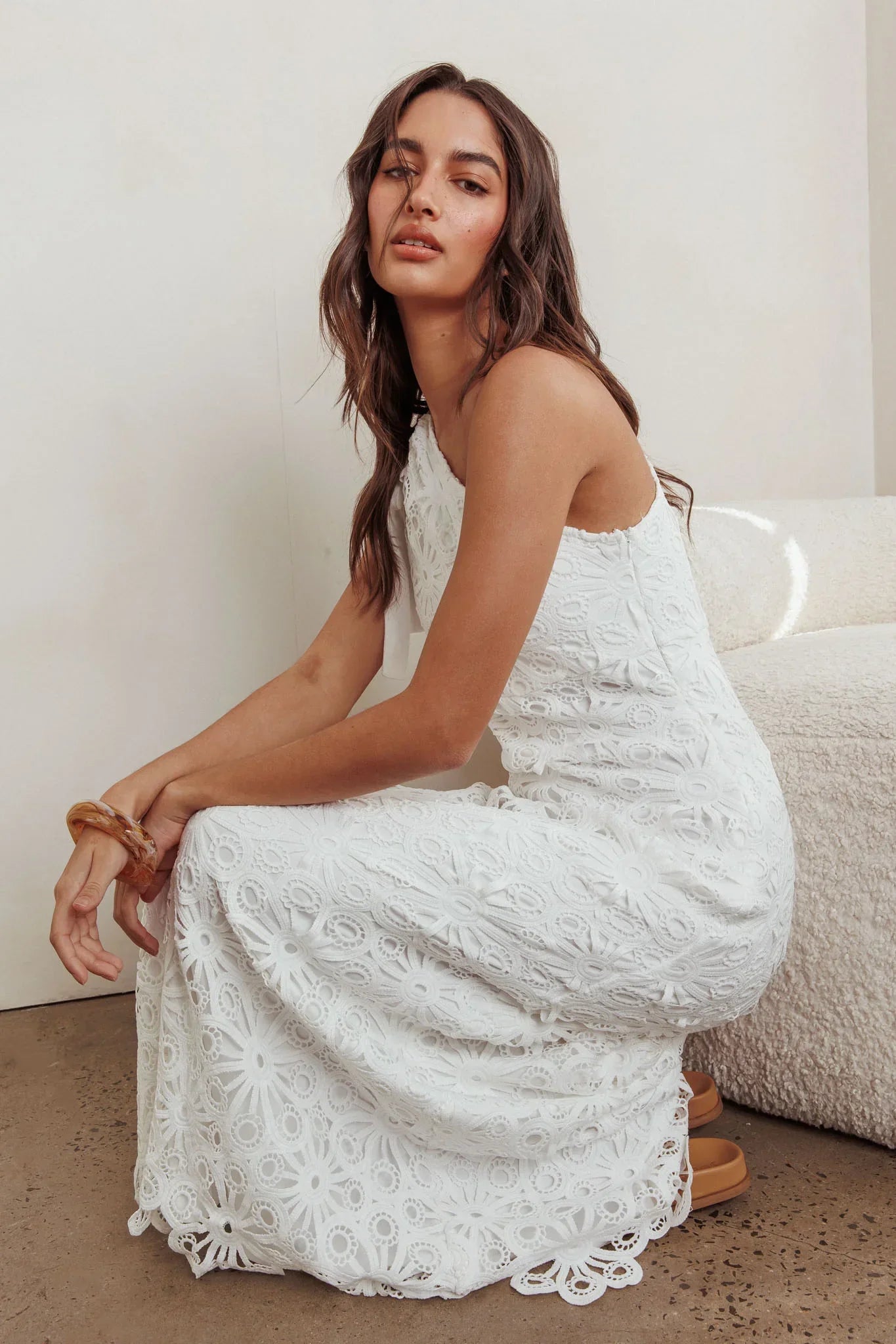 We've fallen head over heels for our dreamy Artice maxi dress. Featuring the prettiest lace fabric and a flattering one shoulder design, you'll be flooded with compliments! Perfect for Sunday brunch with your besties or a flirty dinner date. Team it with tan mules to complete the look!