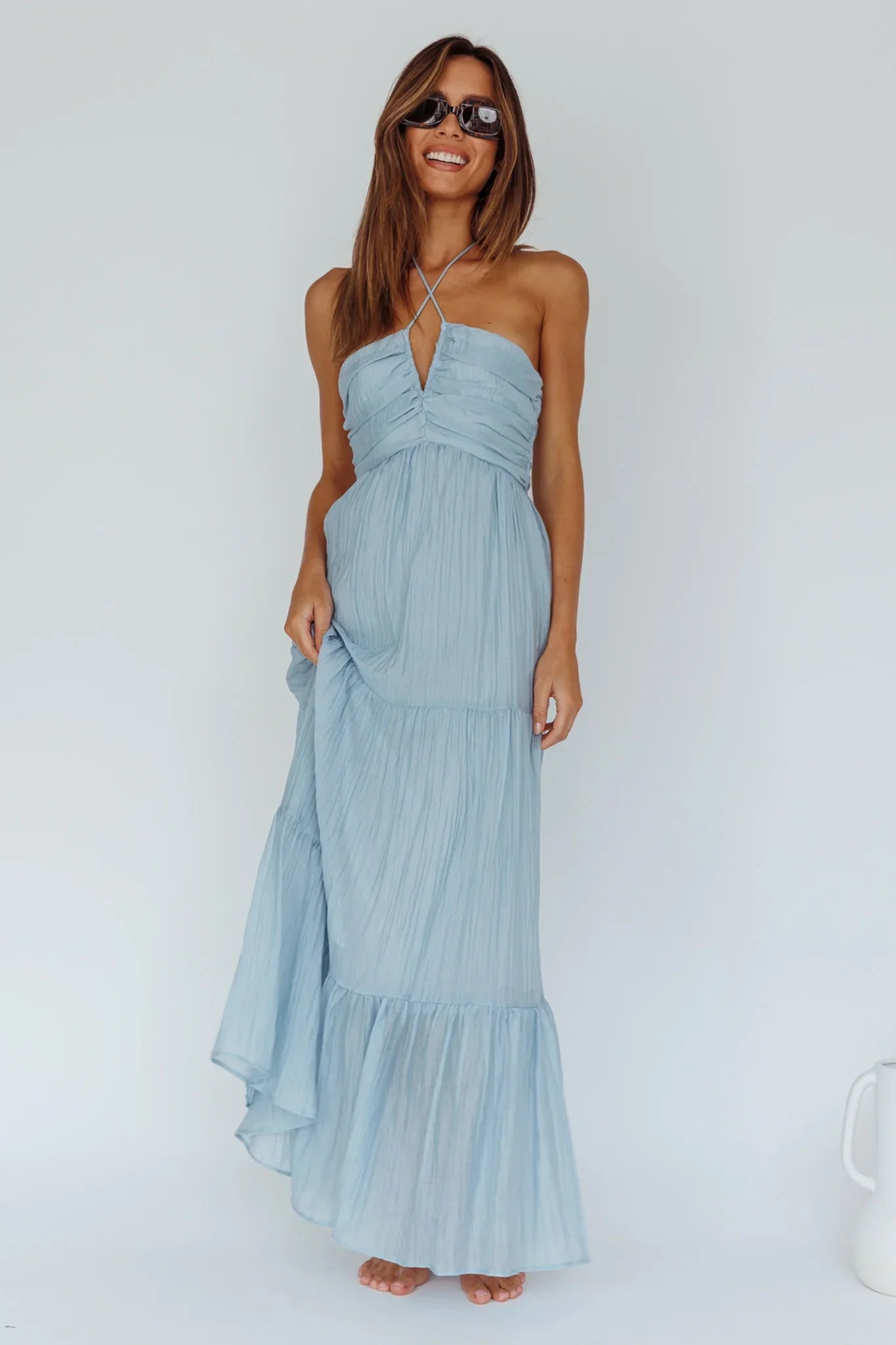 Float through your weekend in our gorgeous Asiah maxi dress. Featuring a crinkle-textured fabric and V-wire in the bust. It's perfect for strolling the farmers' markets with your beau or lunch dates with your besties. Team it with straw wedges and a woven bag for a chic look we are loving.