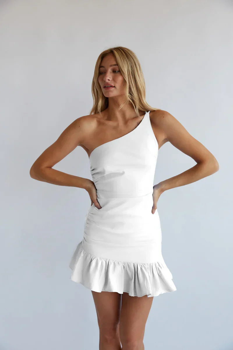 Be the life of the party in the Athena Ruched One Shoulder Mini Dress! Featuring a ruffle hem, open back, a ruched body, and an asymmetrical one shoulder strap. Step into some new to complete this party look.