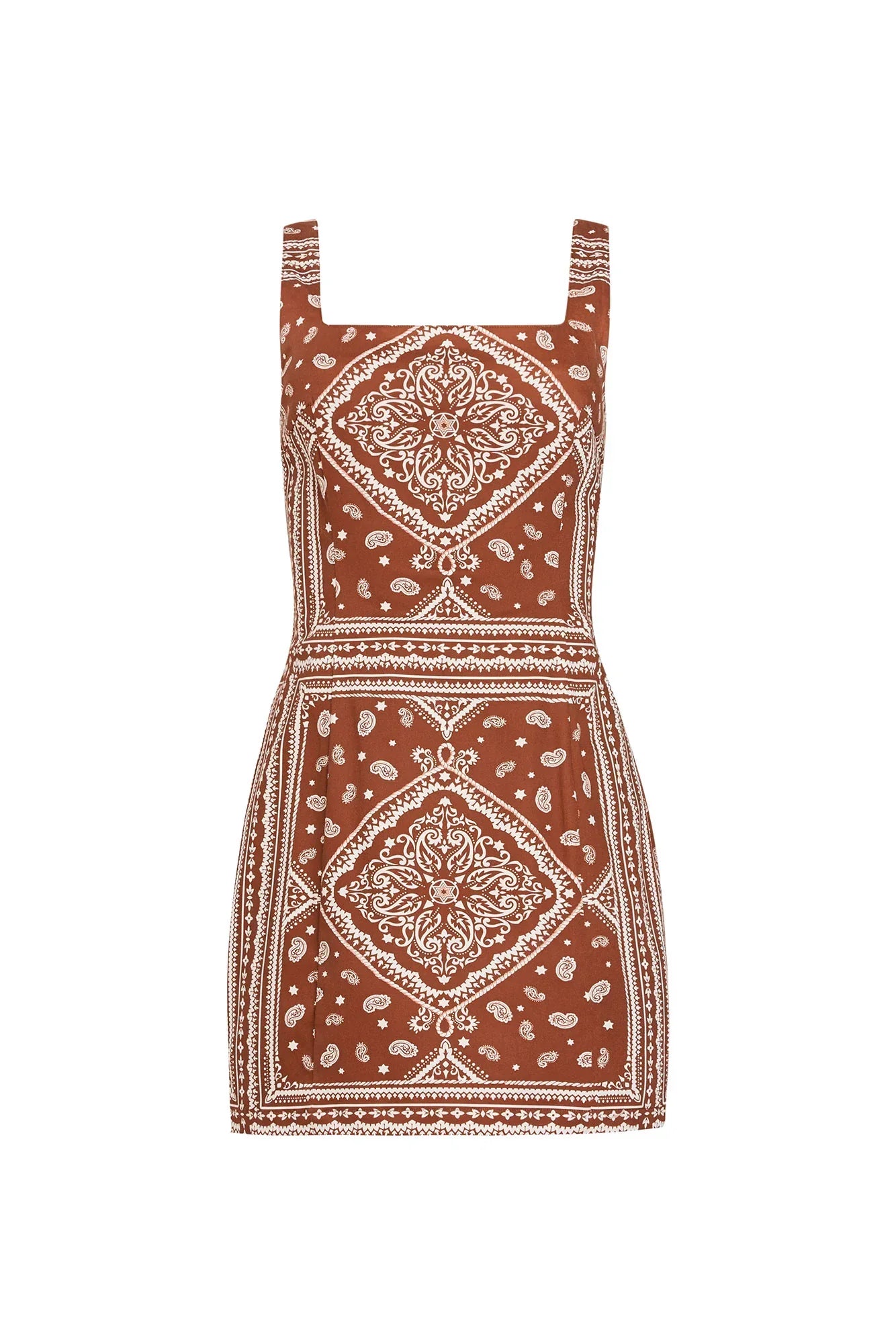 Play it cool in the Augustine Dress. With a square neckline, mini cut, and bold bandana print, this western-inspired piece brings a cool sense of edge to your summer wardrobe. Pair with an oversized denim jacket and cowboy boots to complete the look.