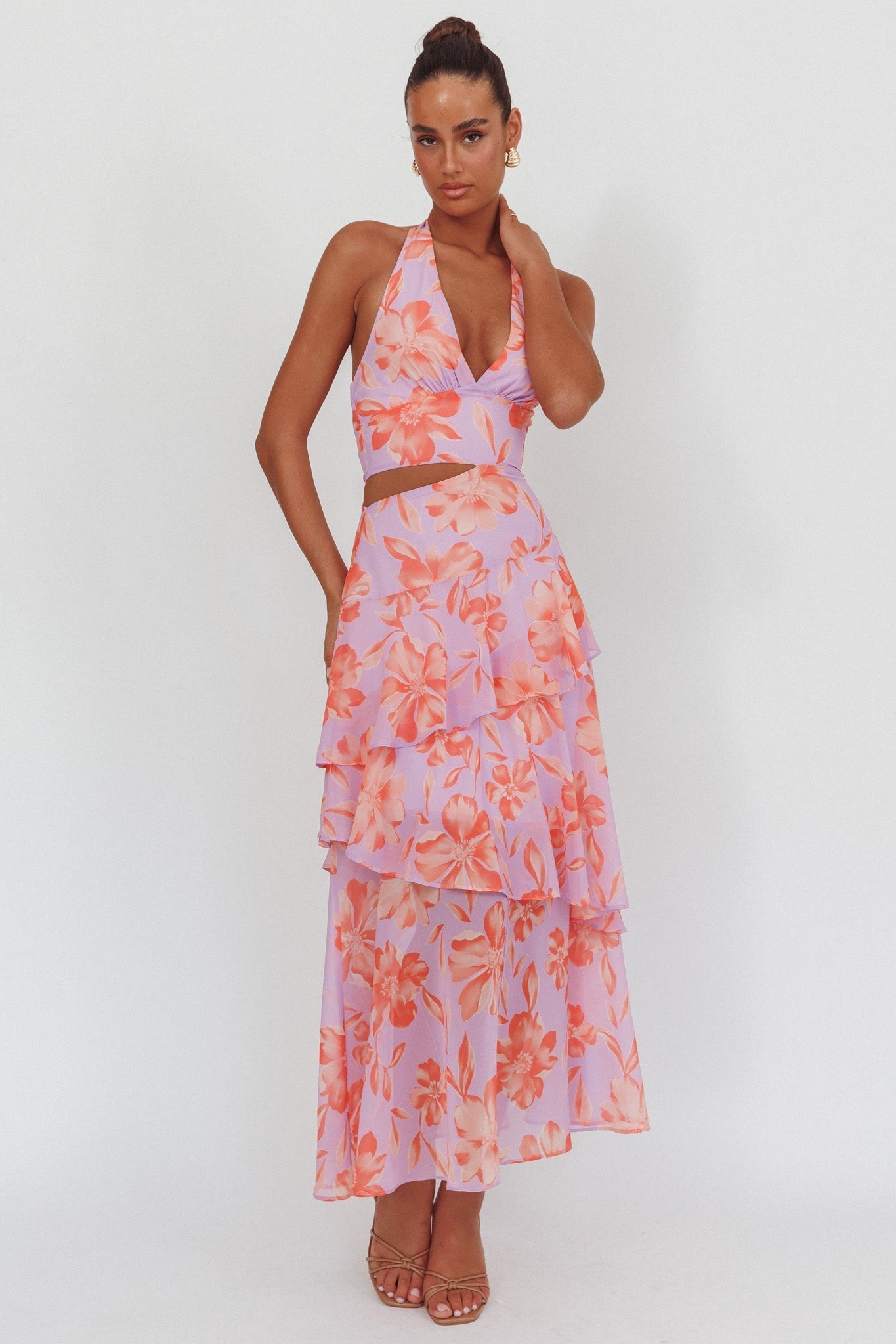 We've fallen head over heels for our dreamy Aura Points dress. Featuring the prettiest floral print and tiered ruffles in the skirt, you'll be flooded with compliments! Perfect for Summertime Sunday brunches with your fave girlies teamed with kitten heels to complete the look.