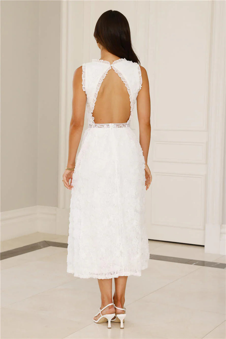 Step into romance with the Ballet Era Lace Midi Dress, featuring delicate embroidery, a graceful V-neck, an intricate lace design, a flowy skirt, and dainty frill trim for the ultimate ethereal look! Style with heels.