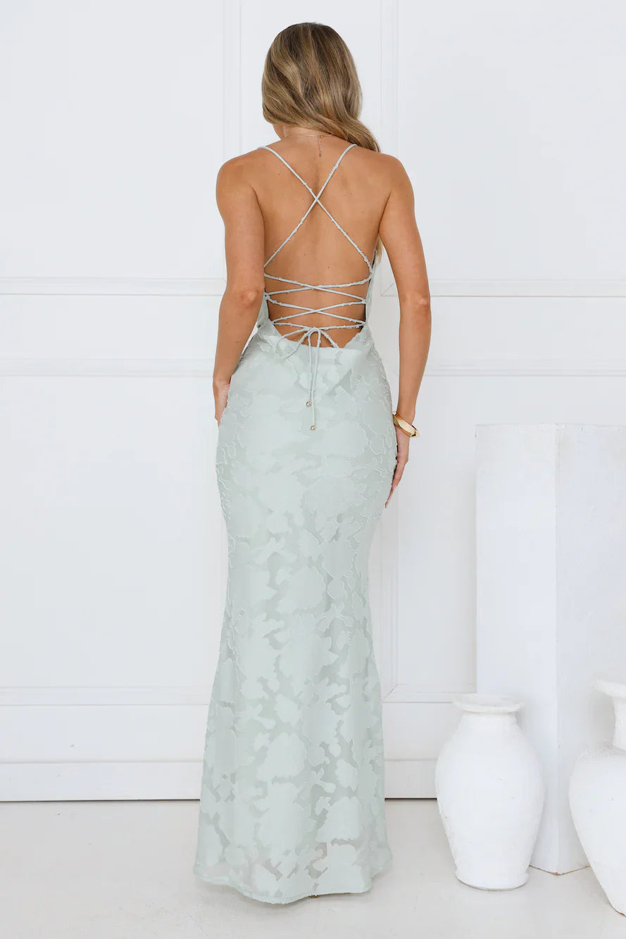 The Bridge To Wonderland Maxi Dress features a textured design fabric, a subtle cowl neck, and a crisscross back. Pair it with delicate heels and a clutch for an elegant, dreamy vibe.