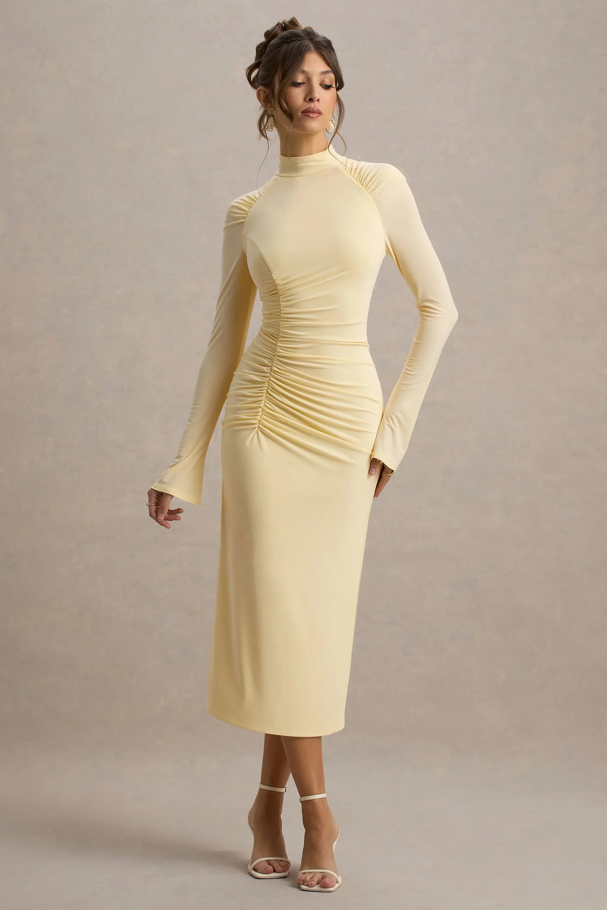 Cassandra is the ultimate number-one go-to for any weekend destination. Whether out in the city or brunching with the girls, this chic midi dress is perfect for every occasion. Crafted from premium pale lemon stretch jersey and adorned with romantic ruched drapery, it's a style hard to take your eyes off. Leave the room knowing your style was on point with this look.