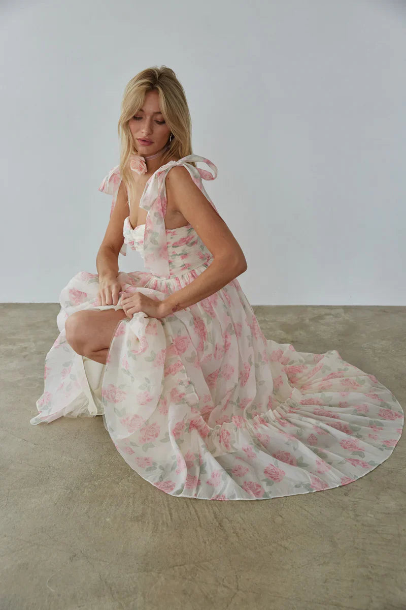 You'll love how you look in the Celine Floral Tie Strap Bustier Maxi Dress! This stunning dress features a feminine floral print, adjustable bow straps, a bustier style top, and a ruffle hem. Pair with a simple to complete the look!