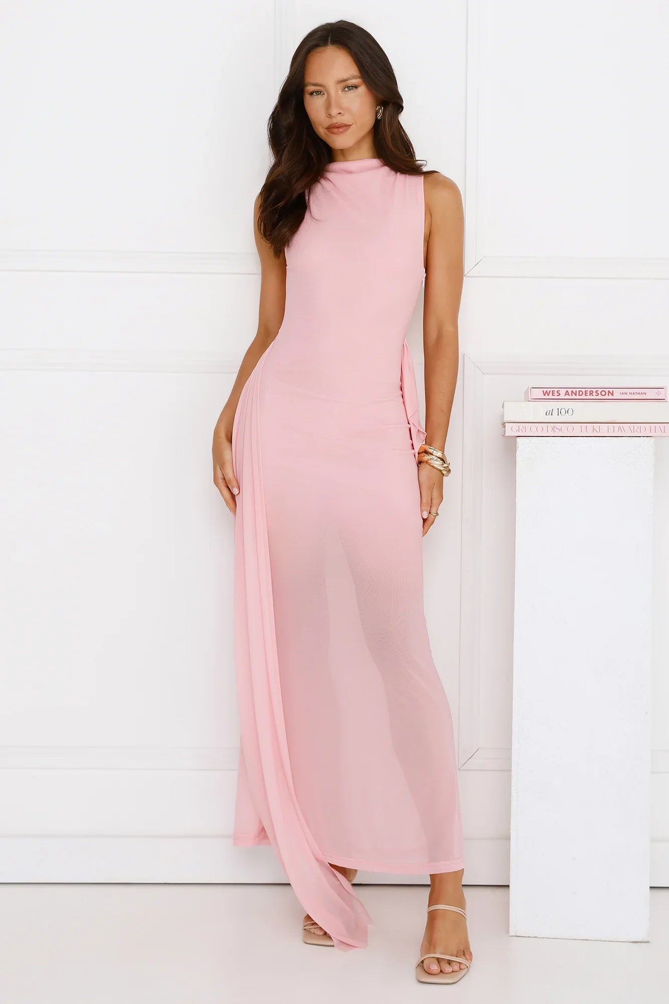 The Dazzle Me Darling Mesh Maxi Dress features a flowing mesh design with a waist tie and sheer hem, giving it a soft, romantic feel. Pair with heels for a chic, effortless look.