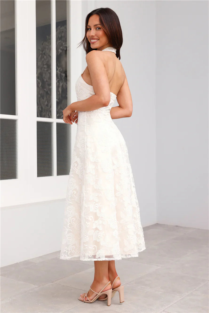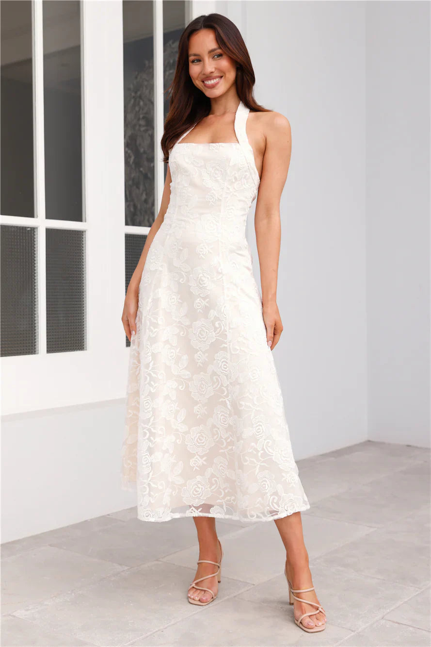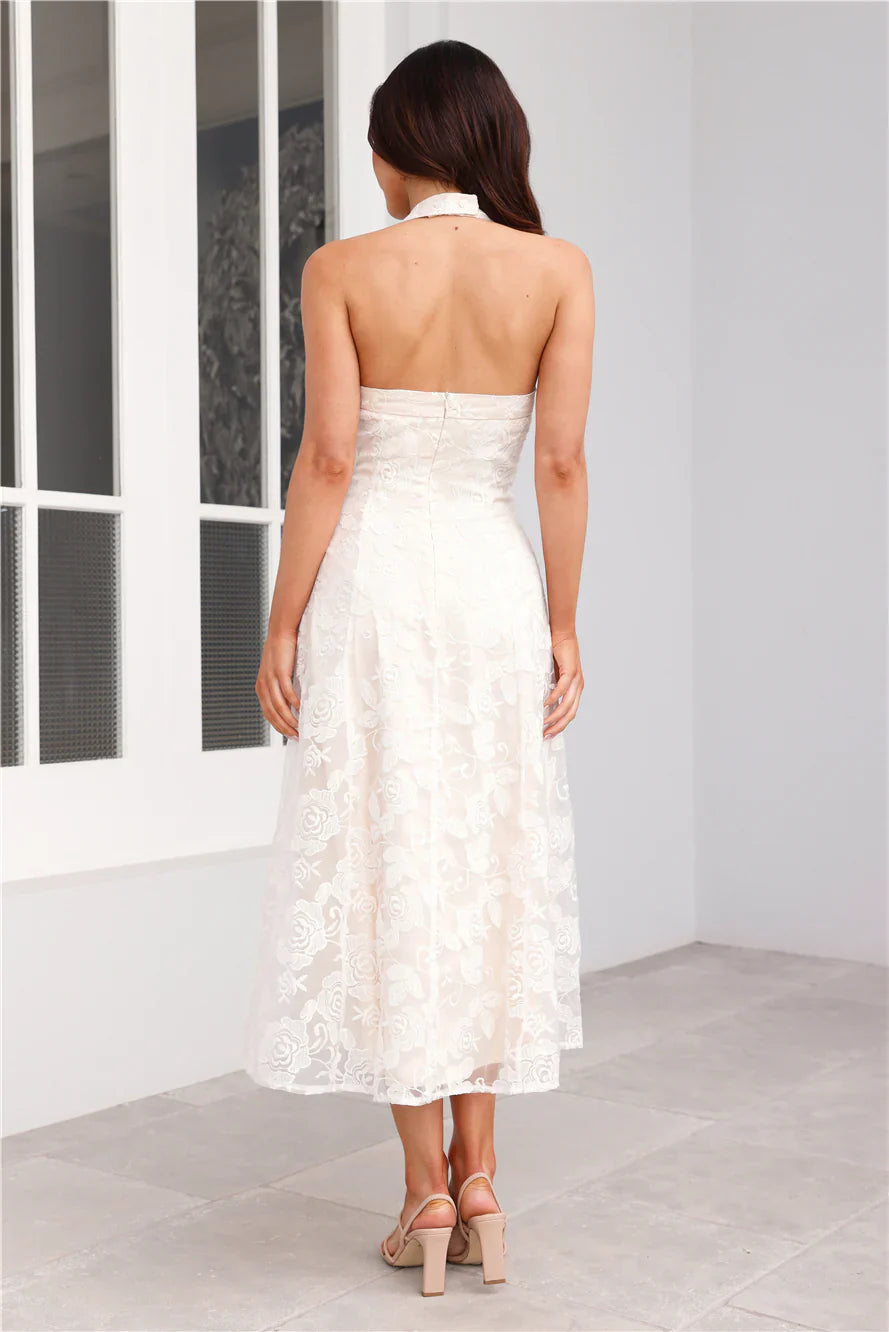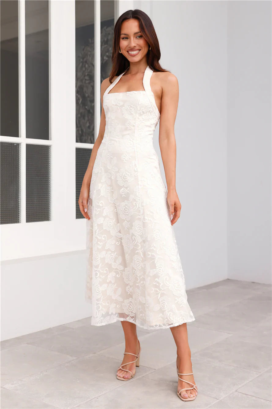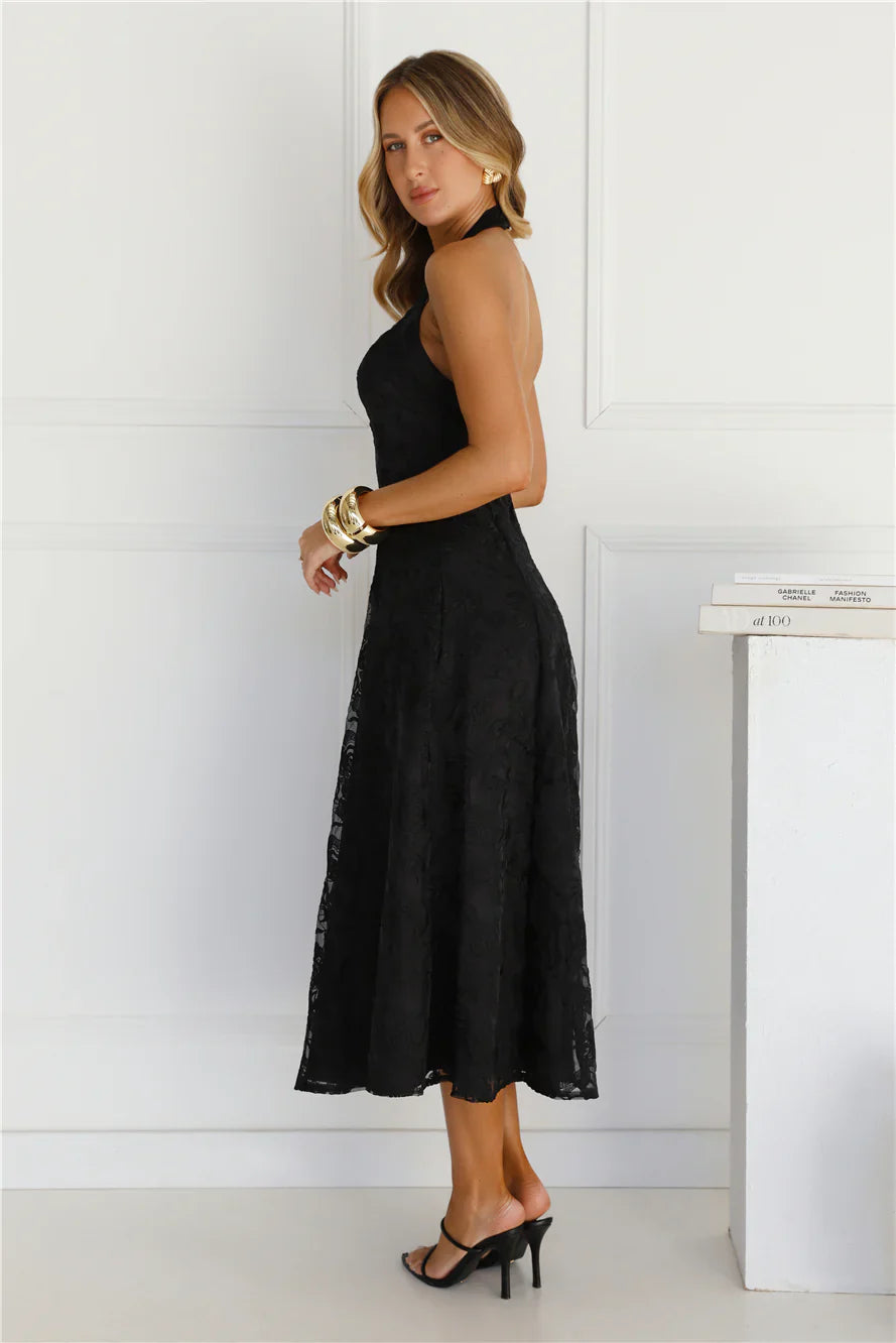 Channel your stylish side with the Disco Daze Halter Midi Dress. Featuring a gorgeous sheer overlay with a floral design, a halterneck with button closures and a flowy skirt. Style with heels and curls for a 'fit we're in love with.