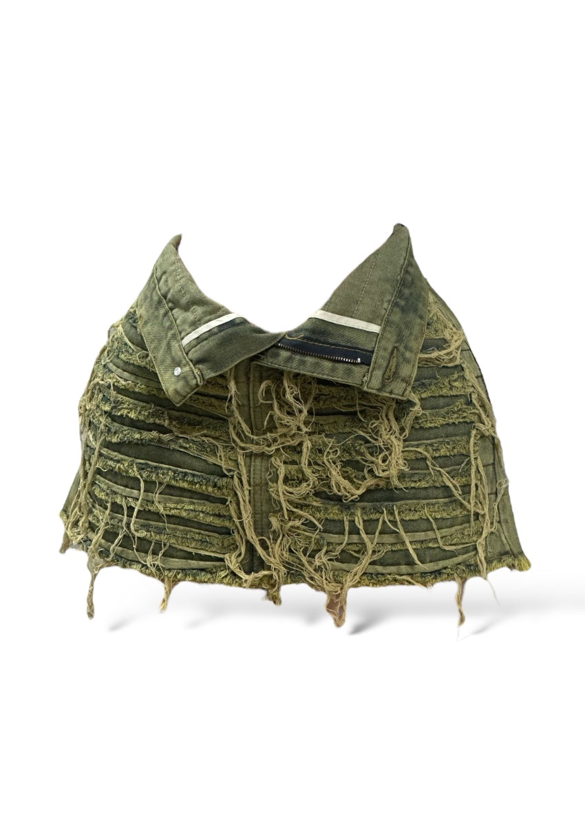 This skirt boasts a chic. edgy look with its artfully frayed hem and strategically placed rips that add a touch of rebellious charm. Made from premium denim. it offers both durability and comfort. making it perfect for all-day wear.