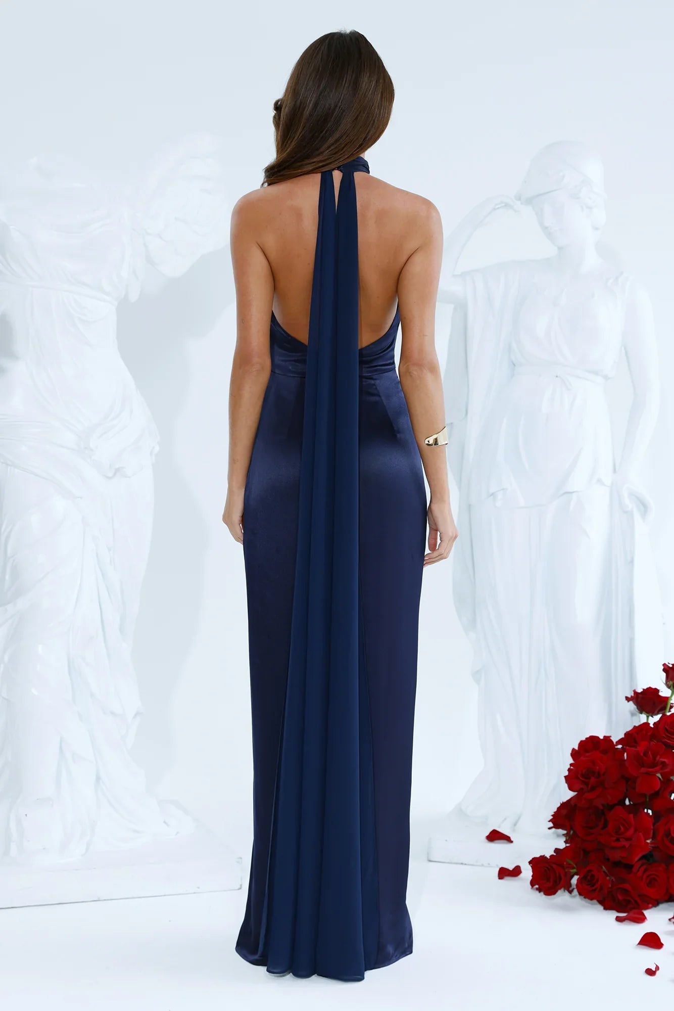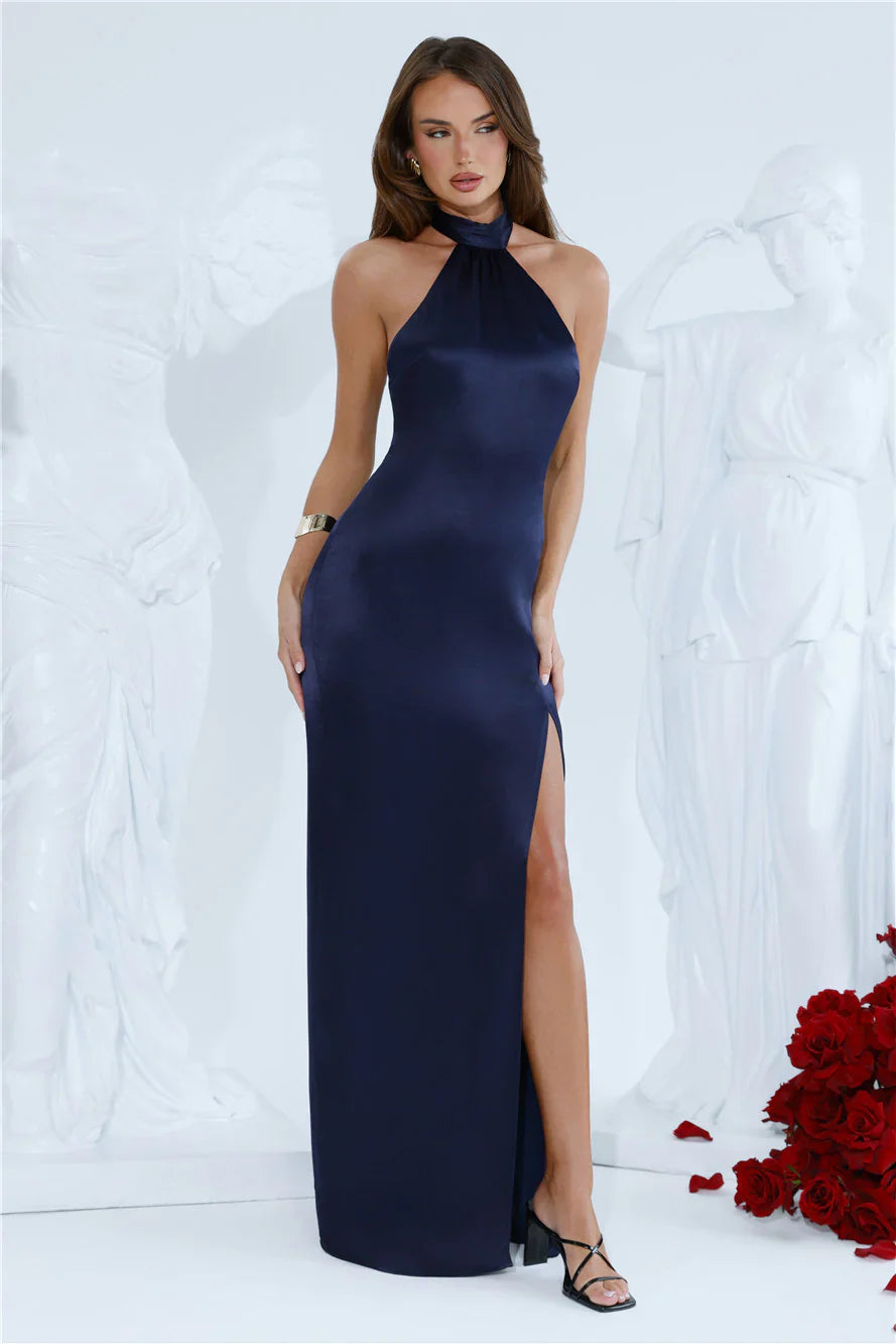 Turn heads in the Effortless Luxe Halter Satin Maxi Dress. With a halter neckline, a flowing train at the back, and a striking split to the skirt, this satin maxi dress balances drama and elegance effortlessly. Style it with heels and jewellery for a formal evening.