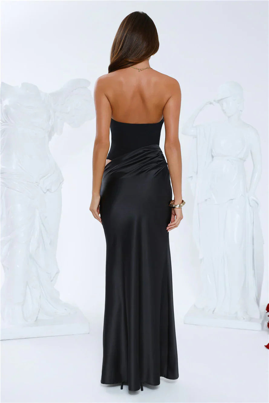 The Elevated Simplicity Strapless Satin Maxi Dress brings sleek design and modern detailing together in one statement silhouette. Featuring a stretch mesh bodysuit-style top with a secure closure, cutout waist, and a strapless neckline, this dress flows into a satin maxi skirt. The soft, fluid skirt completes the look with timeless elegance.