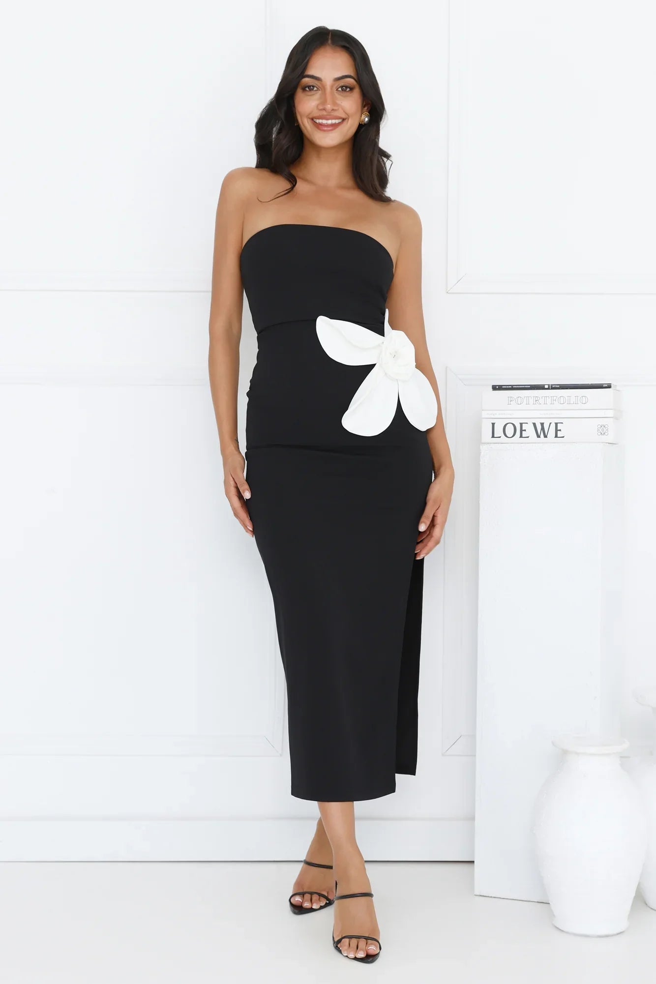 It's heating up, lovely. The Elisandra Strapless Midi Dress is your ticket to compliments. Featuring a strapless design, a flower applique to the side and a side split for comfort. Style with heels and curls!