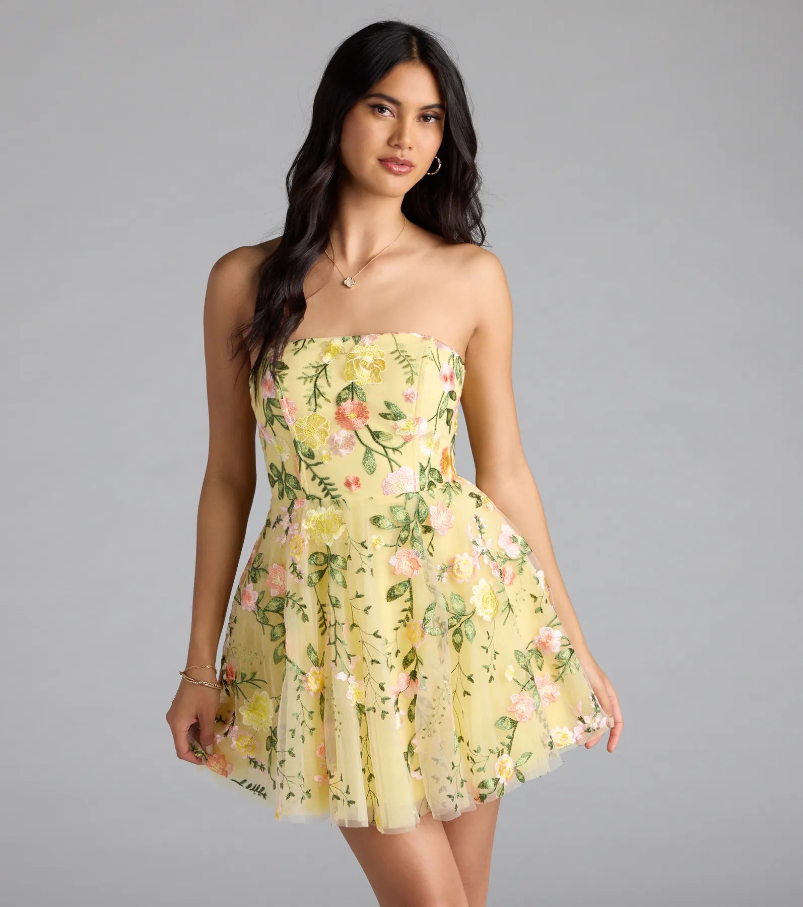 With the most darling detail, the Emilliana skater dress will be the most adorable in the room! The short dress boasts a flirty lace-up back that turns heads and a beautiful floral embroidery pattern.