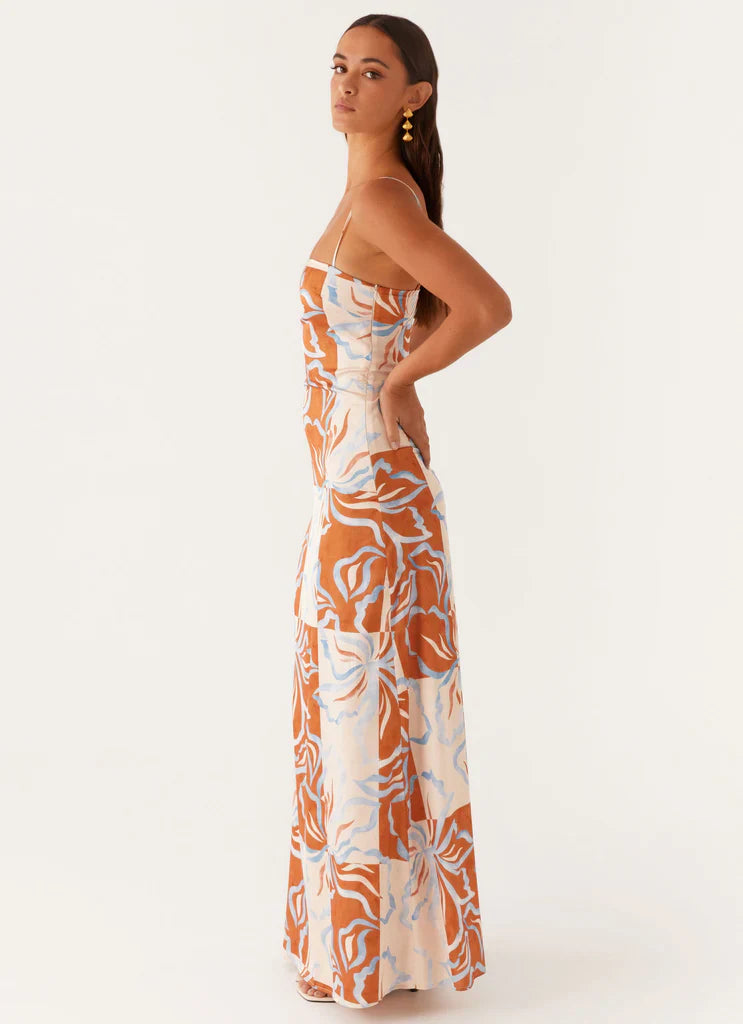 The Aster Bloom Maxi Dress features a straight neckline that elegantly frames the décolletage. Fully lined for comfort and style, this dress showcases an exclusive print that adds a unique touch to your evening look.