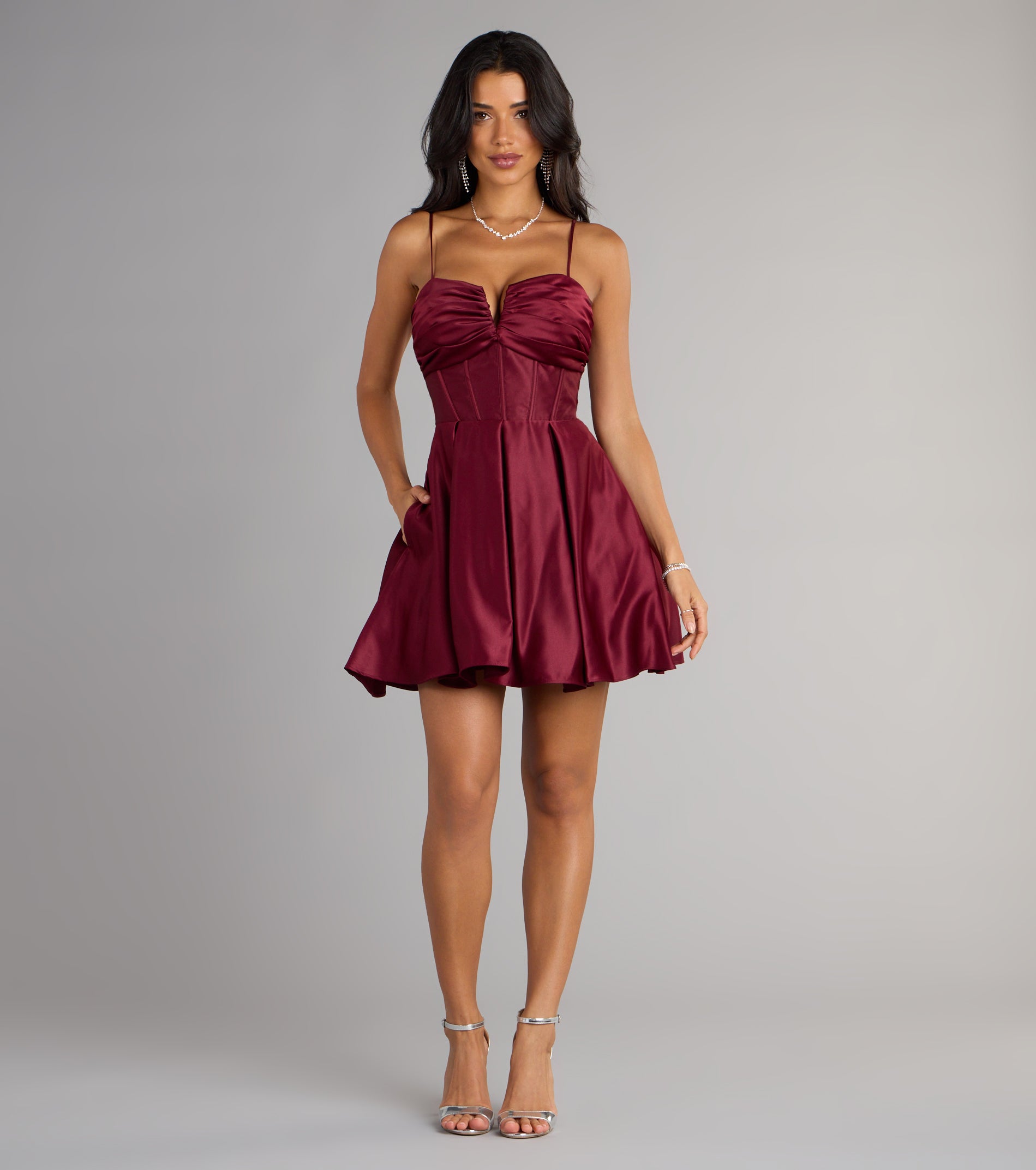 Made for the nights you won’t forget, the Joelle satin skater dress pairs a structured corset bodice with a twirl-worthy moment. With delicate straps, a lace-up back, and a pleated fit-and-flare silhouette, it’s the perfect mix of polished and playful.