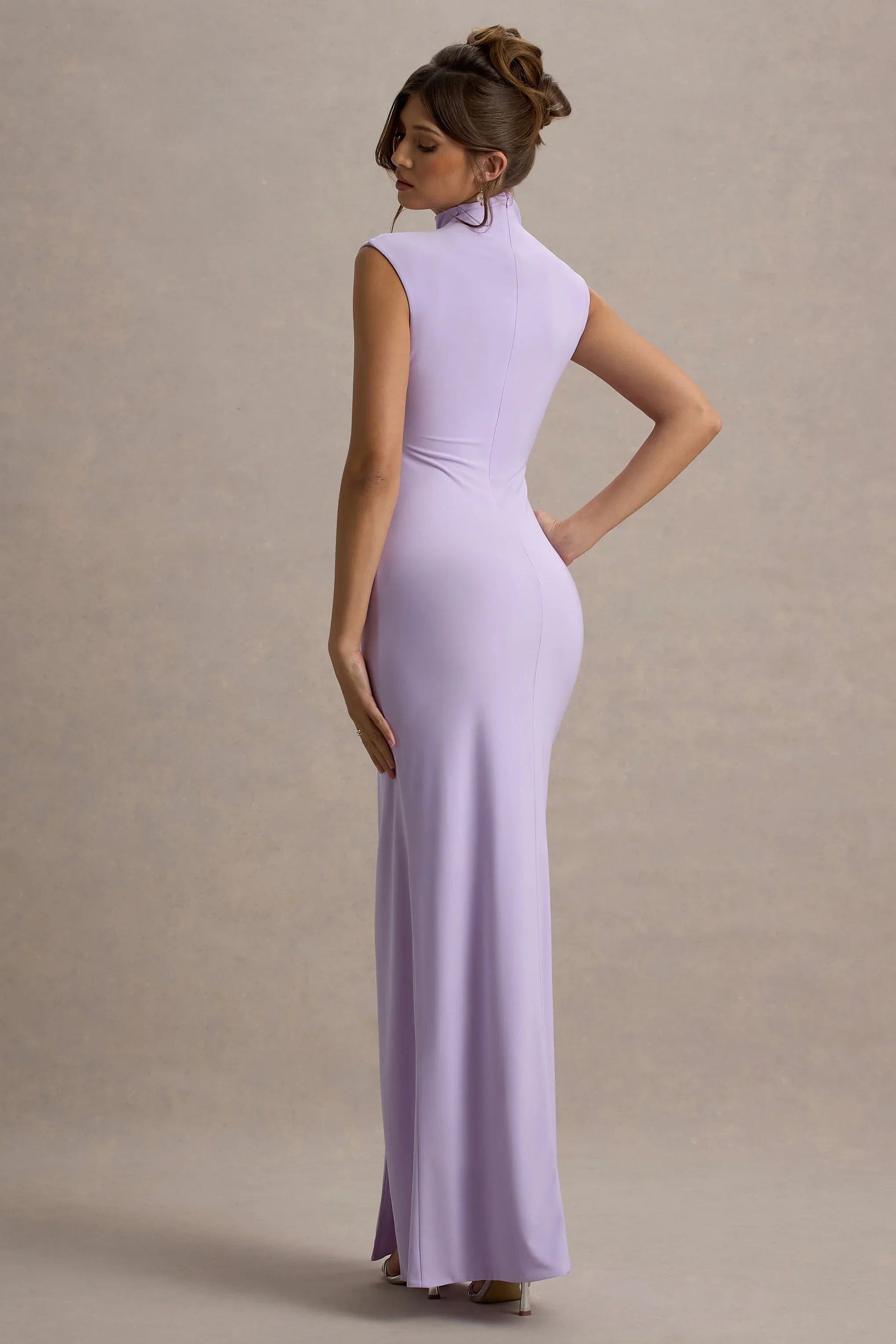 As flattering as it is flawless, captivate from all angles in Lanetta. Crafted in a lilac shade of our premium jersey known for its stretch properties, this curve-enhancer boasts flattering ruching to cinch your natural silhouette. Further enhancing its charm is a delicately tucked high neckline and sultry leg split that's ensured to turn heads at your next event.