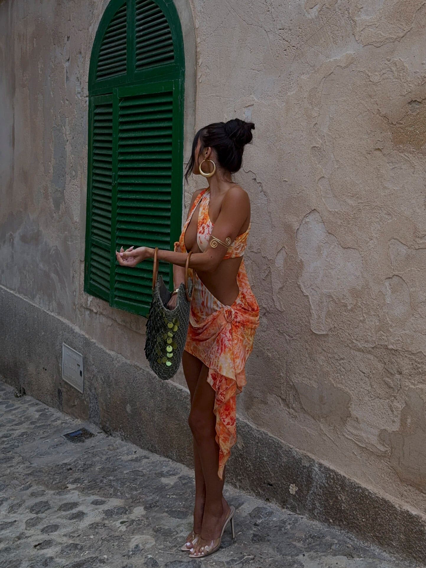 Style with gold statement earrings and lace-up heels for a look that’s ready to turn heads from sunset cocktails to moonlit beach parties.