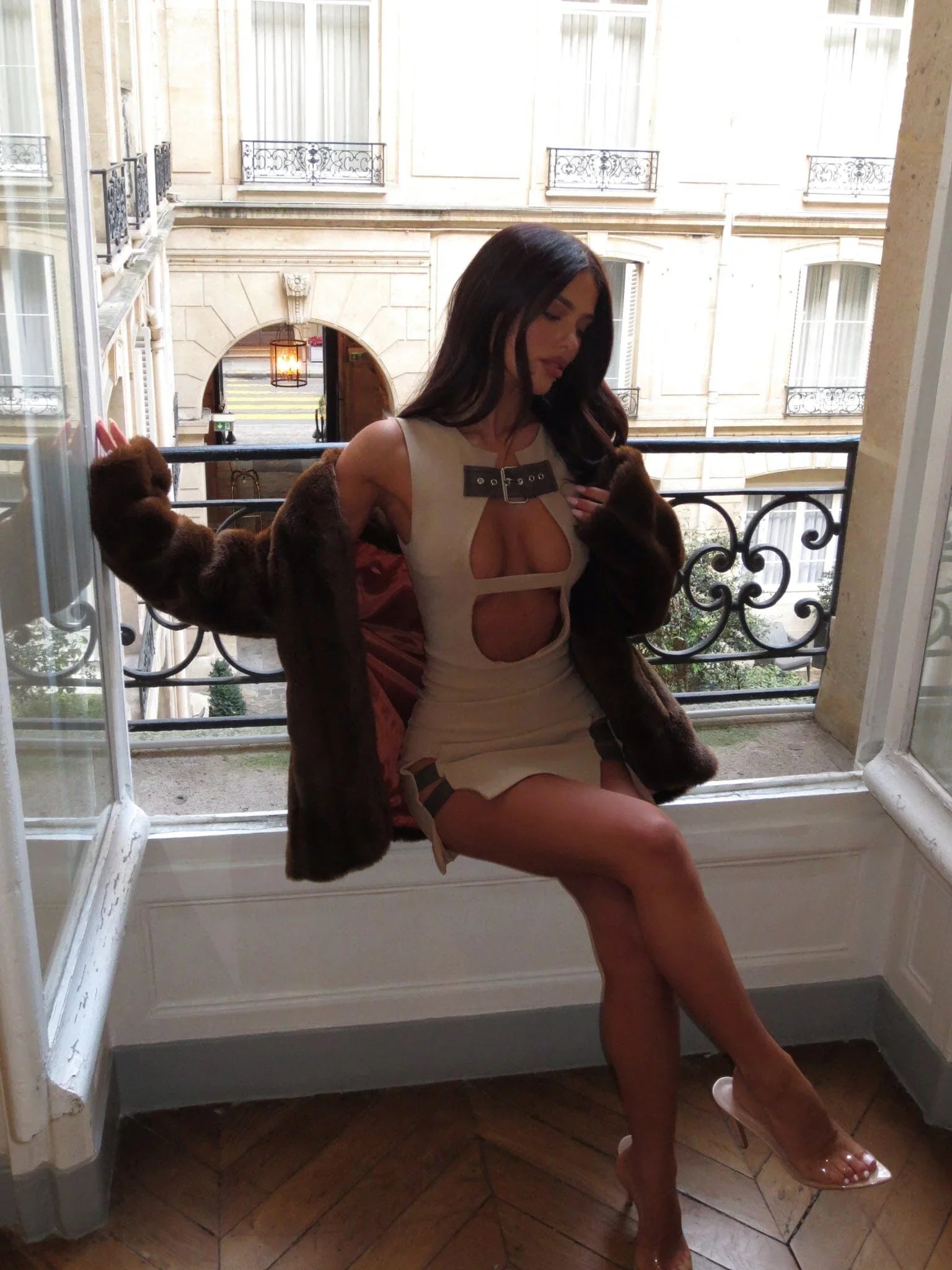 Crafted with a stretch suiting fabrication and figure-hugging bodycon fit, this sleeveless mini is fully lined for a smooth finish. The edgy PU buckle belt detail at the neckline adds a statement touch, perfectly complementing the sultry plunge neckline with a keyhole cut-out. Dual high splits, complete with strapping details, create a bold yet balanced look, while the invisible zipper closure ensures a seamless silhouette.