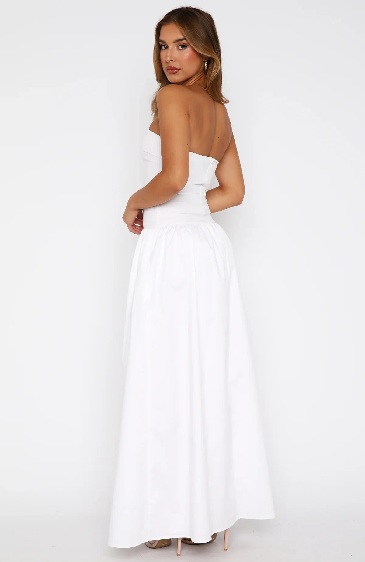 Elegant and chic. The Take Back Maxi Dress White features a strapless design with gel grip on bust, invisible centre back zipper and closure, fitted bodice design, and gathered skirt detailing. Style with pointed toe heels and gold accessories for an old-money look!